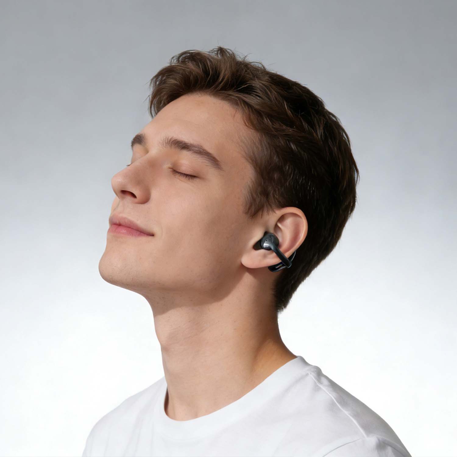 Semi-In-Ear Design & Soft,Skin-Friendly Material Innovative cloud-soft silicone pads provide a bionic wrap with a 24° floating fit for ultra-light, pressure-free comfort. Flexible titanium-alloy memory wire offers strong rebound durability, proven through repeated bending tests.